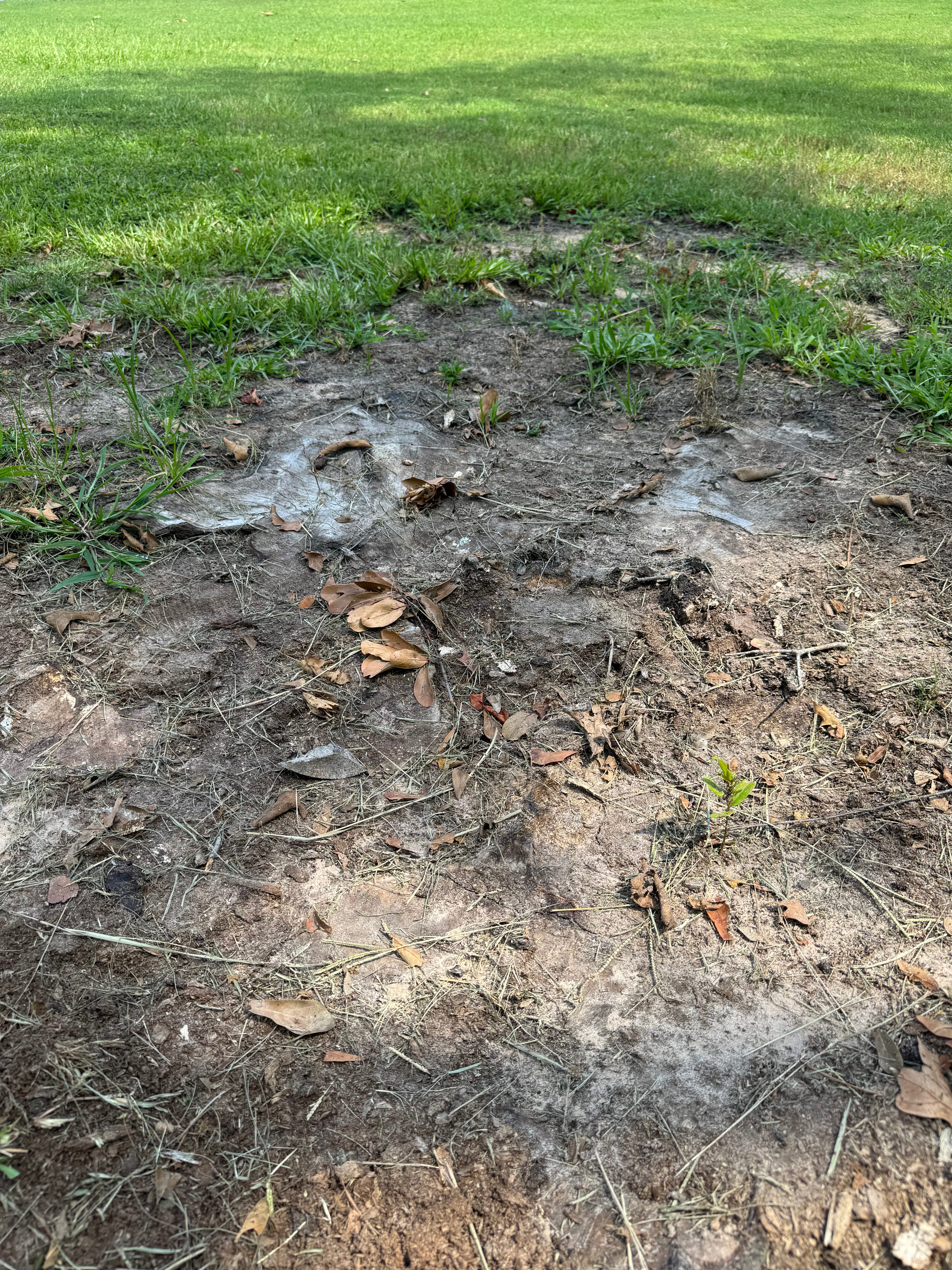 But it was messy. Stump grinders are messy. They work really well, but part of how they work is by obliterating the stump. Wood chips and shards get everywhere. You have to wear protective gear. And when you’re done, it literally scars the earth. Take a look at this example of where a tree once stood. Look how the stump is nowhere to be seen, and yet the ground is scarred: